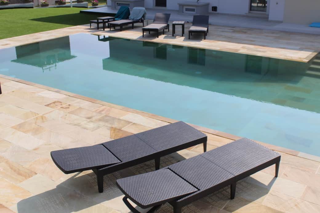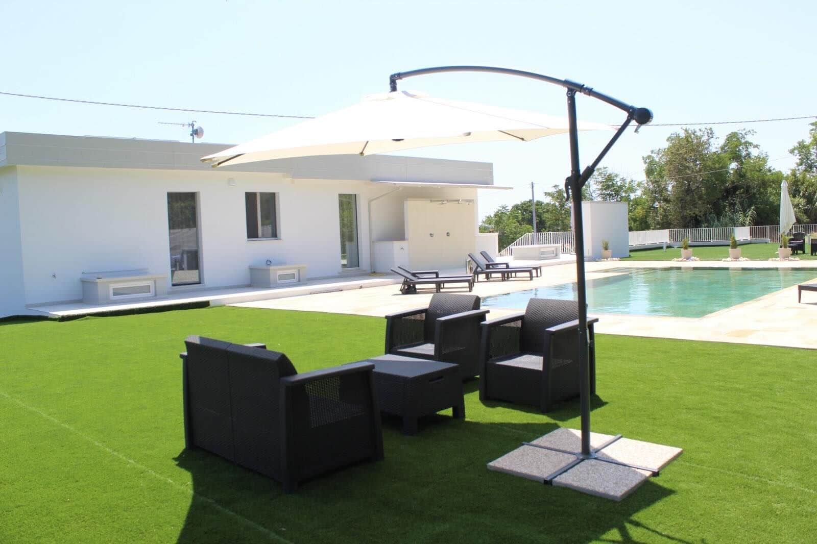 L'area piscina è attrezzata con lettini prendisole e ombrelloni, ideale per godersi il sole e rilassarsi a bordo piscina in un ambiente riservato e curato.